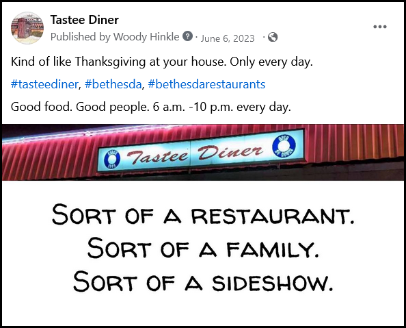 The Diner has no advertising budget, so I was limited to posts on their Facebook page. The goal is to remind customers what a genuine place The Diner is and differentiate it from the high-end restaurants that surround it. The posts were purposely not over-designed, since the Diner itself is not over-designed.